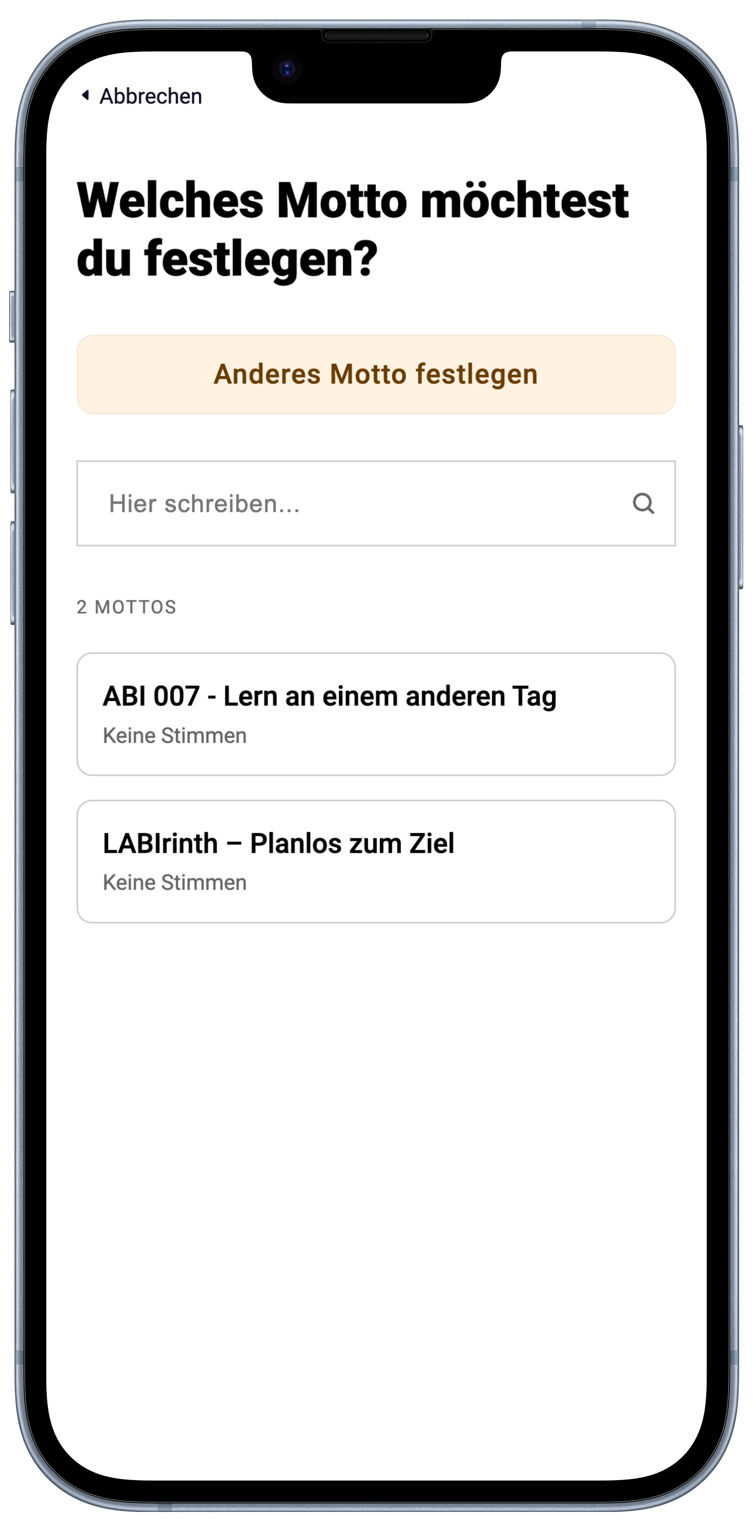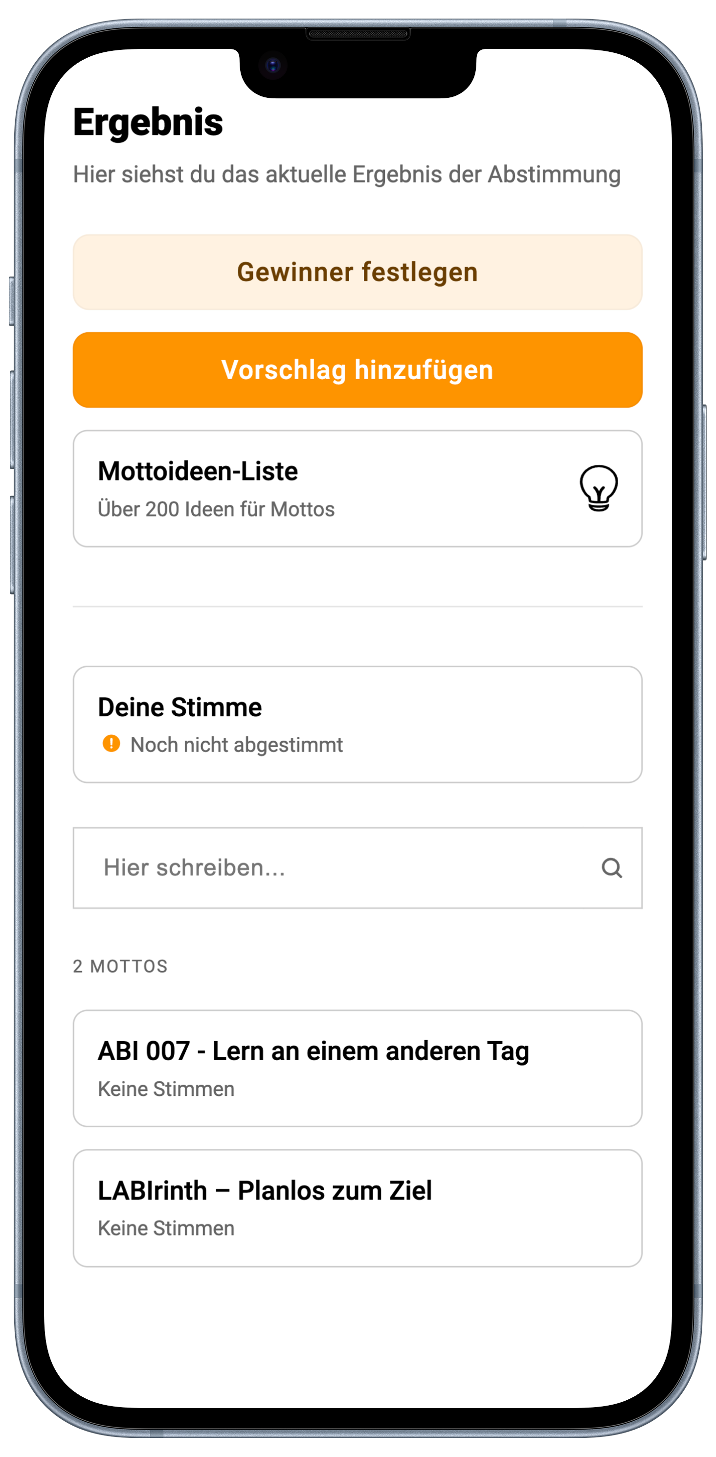 Die Funktion “Gewinner festlegen” wird überwiegend dafür genutzt, falls bereits außerhalb der App für ein Motto abgestimmt wurde und dieses dann nur noch in der App festlegt werden soll.