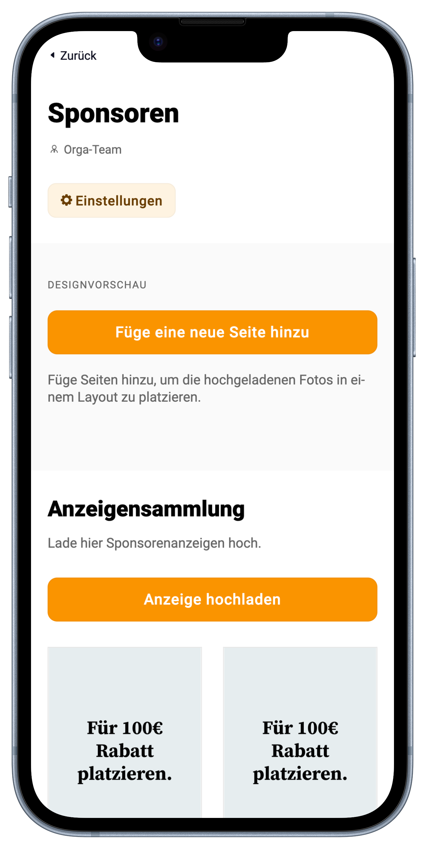 Die Sponsoren-Seite wurde platziert. Platziere nun eigene Sponsoren unter “Rahmen 1”, sofern du bereits einen hochgeladen hast. Klicke nun erstmal “zurück”.