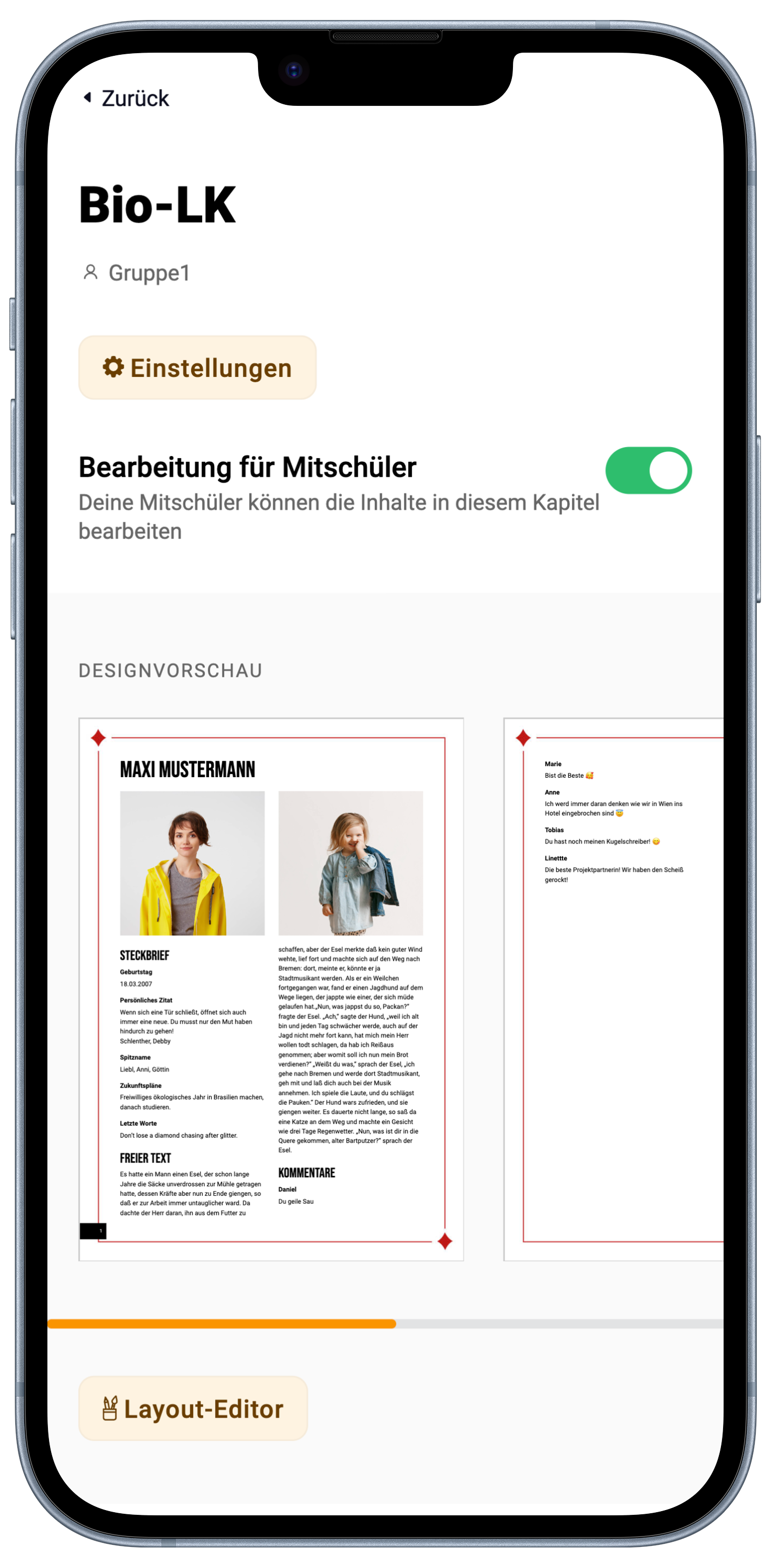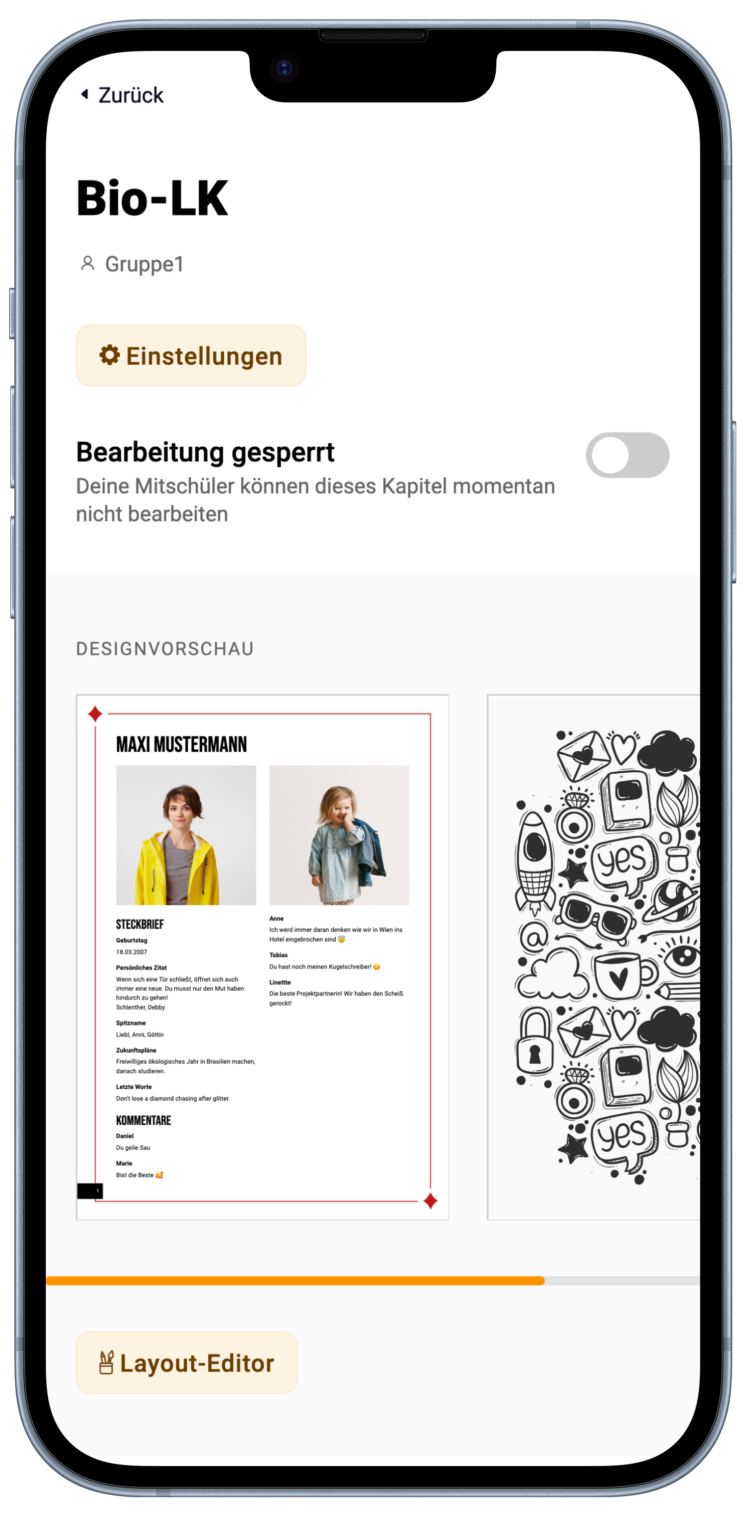 Öffne das Schüler-Steckbrief Kapitel. Kapitel sind standardmäßig gesperrt. Wenn jetzt auf den Regler geklickt wird, öffnet sich das Kapitel.
