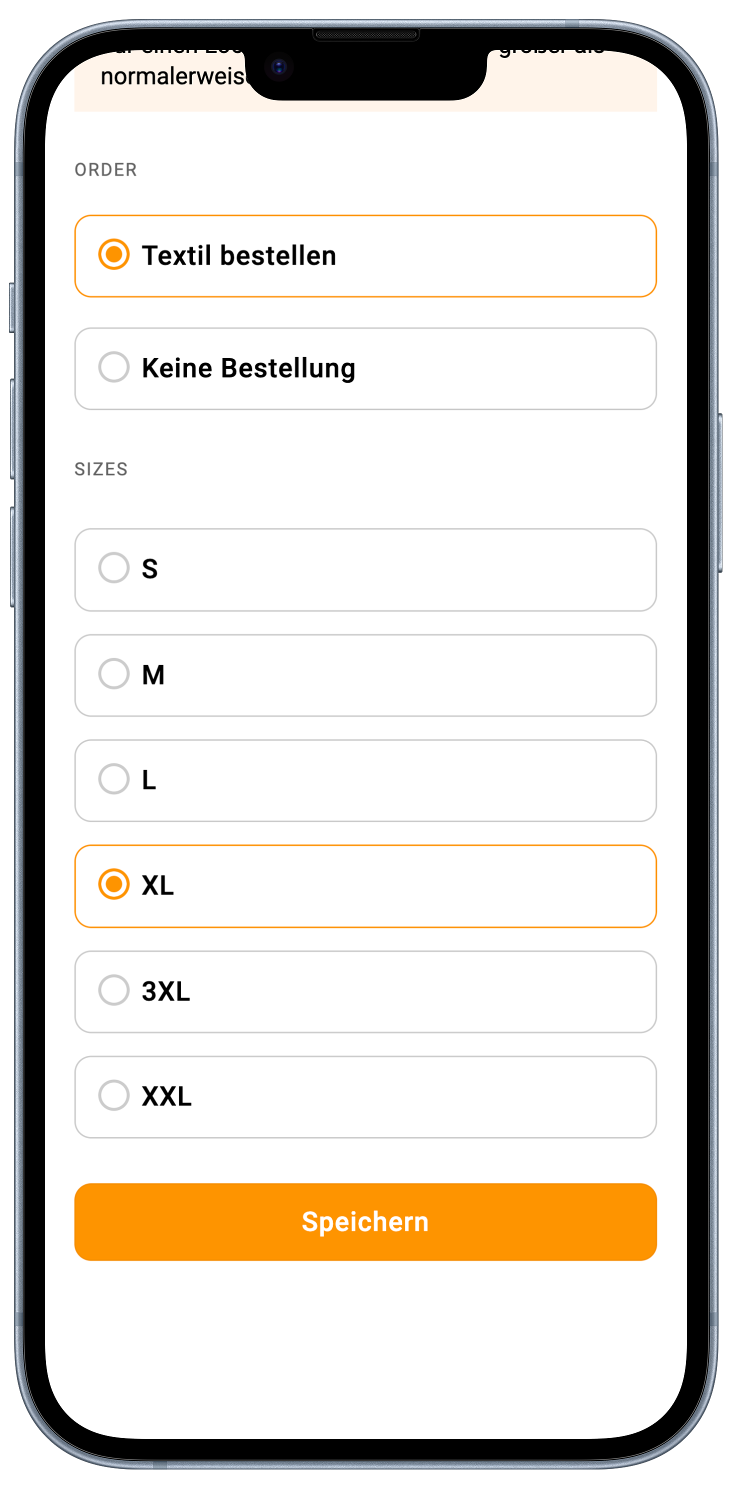Wähle eine Textilgröße aus und klicke auf “Speichern”.