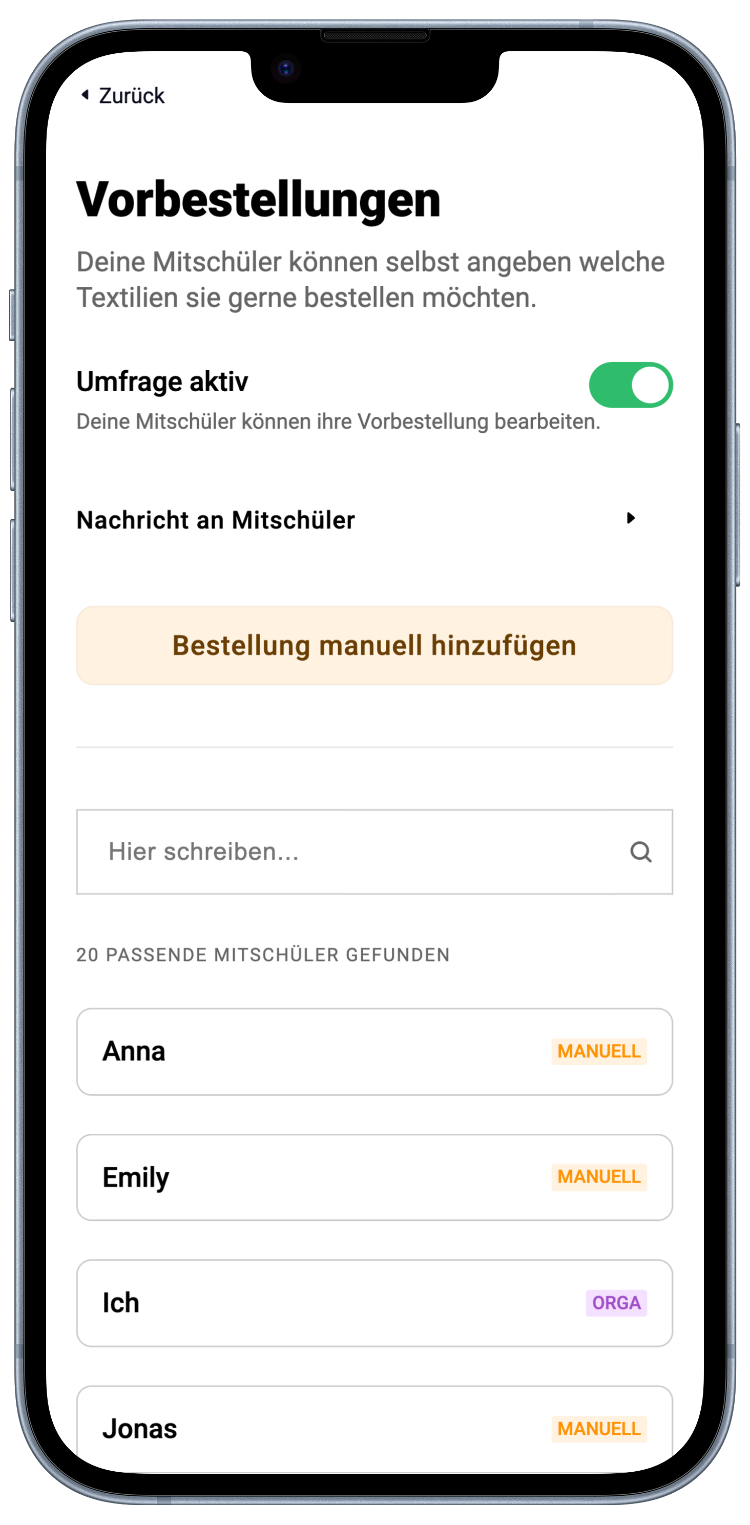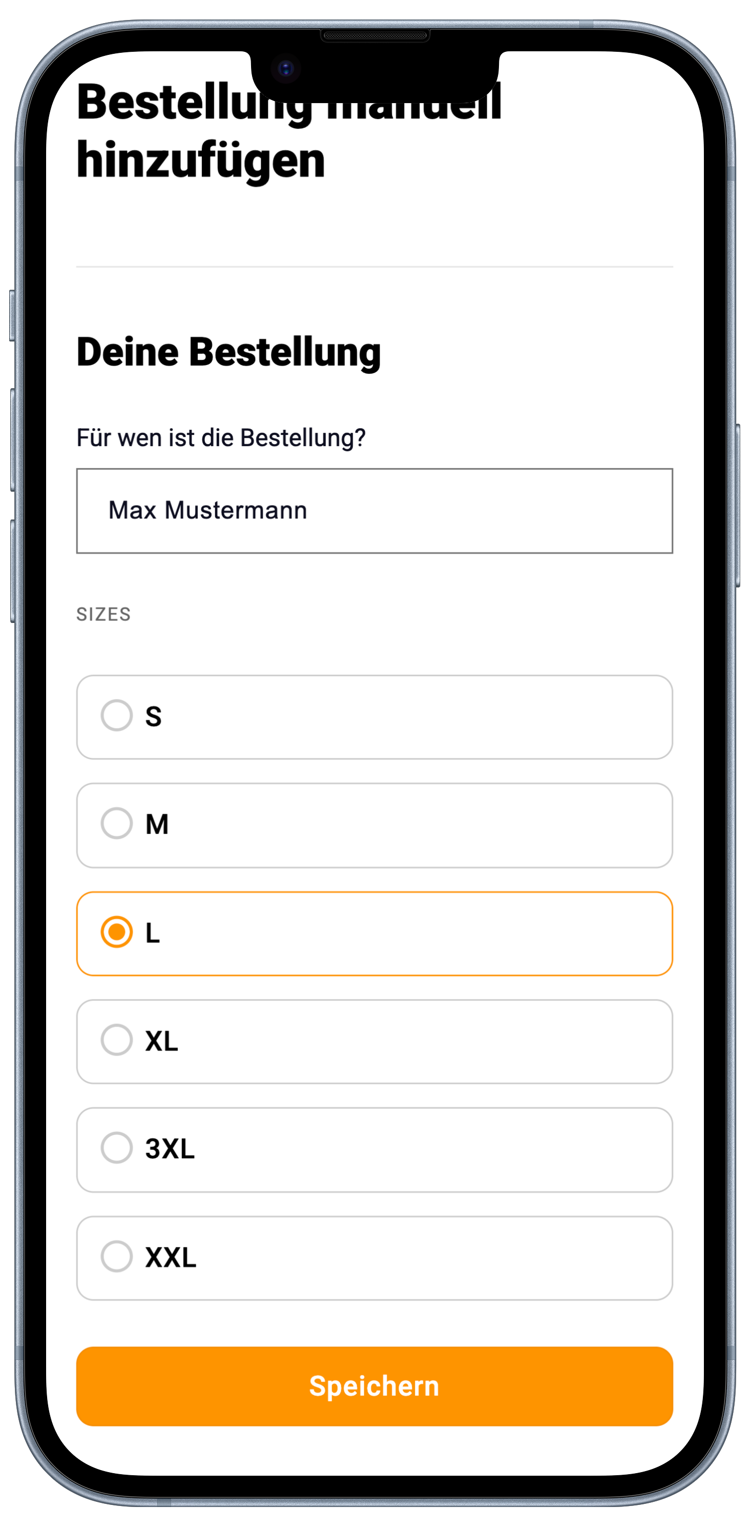 Trage den Namen der Person ein, wähle eine Größe aus und gehe auf “Speichern”.
